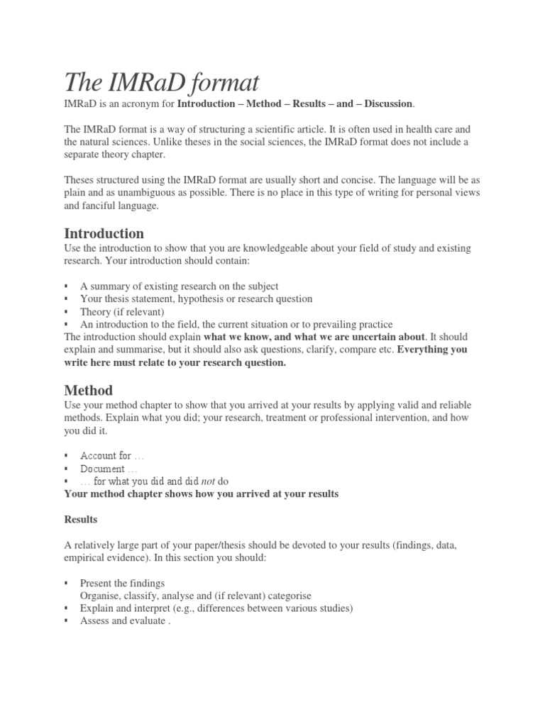 Please fill this form, we will try to respond as soon as possible. May 6, 2019 by proofreadingpal in uncategorized, writing guides. • understand the imrad structure • enumerate the general content of each. Unlike theses in the social sciences, the imrad theses structured using the imrad format are usually short and concise. There is no place in this type of writing for personal views and purple pros. It is often used in health care and the natural sciences. Imrad stands for introduction, methodology, results, and discussion. Other possibilities include this sequence of the sections. Theses and dissertations structured using the imrad format are usually short and concise. The language will be as plain and as unambiguous as possible. Imrad began to be adopted by scientific journals around the 1940s, and quickly became the dominant format for research papers in a majority of leading while imrad seems reflective of the currently dominant view of what is scientific, the format of the scientific paper may be influenced increasingly. What do the findings presented under results above mean? Section • recognize the unique attributes of reporting.